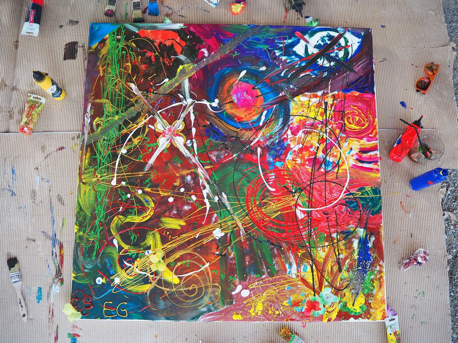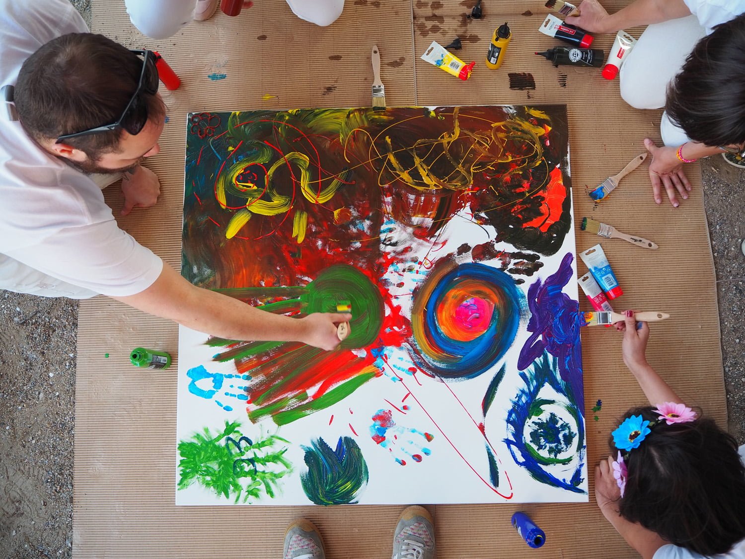 Y con aquellas vistas al valle de Rubió, rodeados de verde y la suave brisa de verano, y la música chill out de fondo, aparecieron pinturas, pinceles y un lienzo en blanco. La creatividad fluyó y entre todos creamos un cuadro, único, especial, lleno de expresiones de color, trazos y texturas. Un creación en equipo, codo con codo, como cada día en Espai Gastronomia.