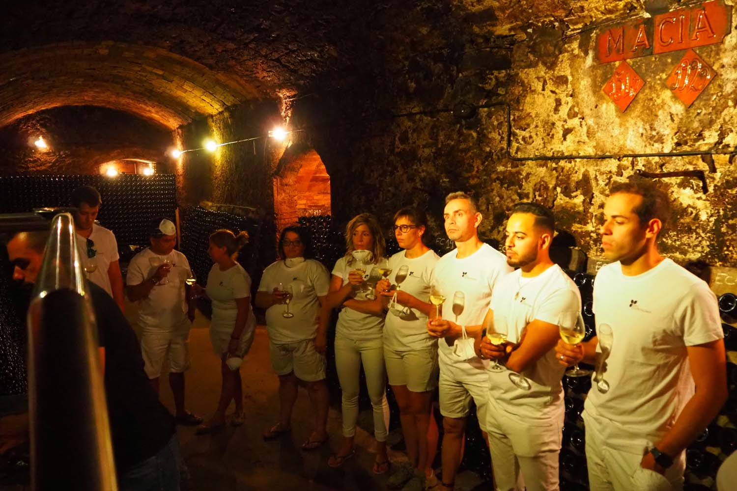 Vam visitar el celler de Caves Bohigas a la nostra finca de Can Macià, i vam accedir-hi amb mascareta. Un cop a l’interior de la cava, ens vam descobrir la cara i vam poder sentir l’impregnant olor d’humitat, fusta i fermentació. L’ambient era fred i humit. I enmig d’aquest entorn vam degustar l’exclusiu cava de Bohigas, Noa, la seva darrera creació.