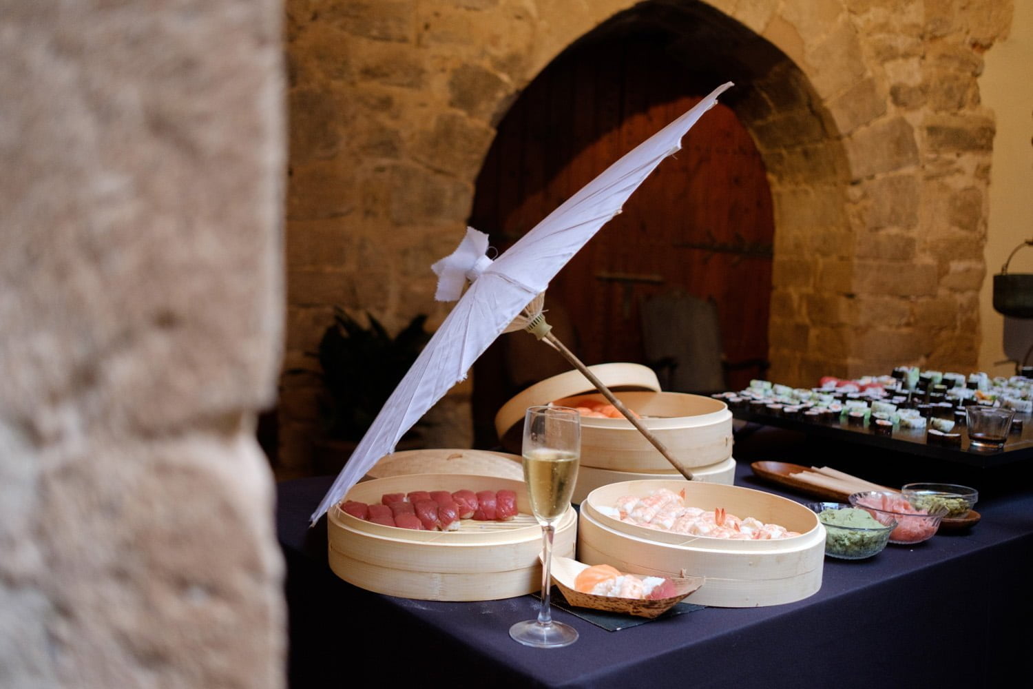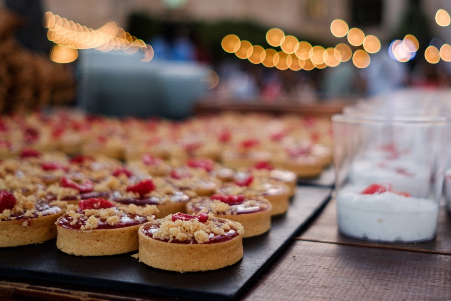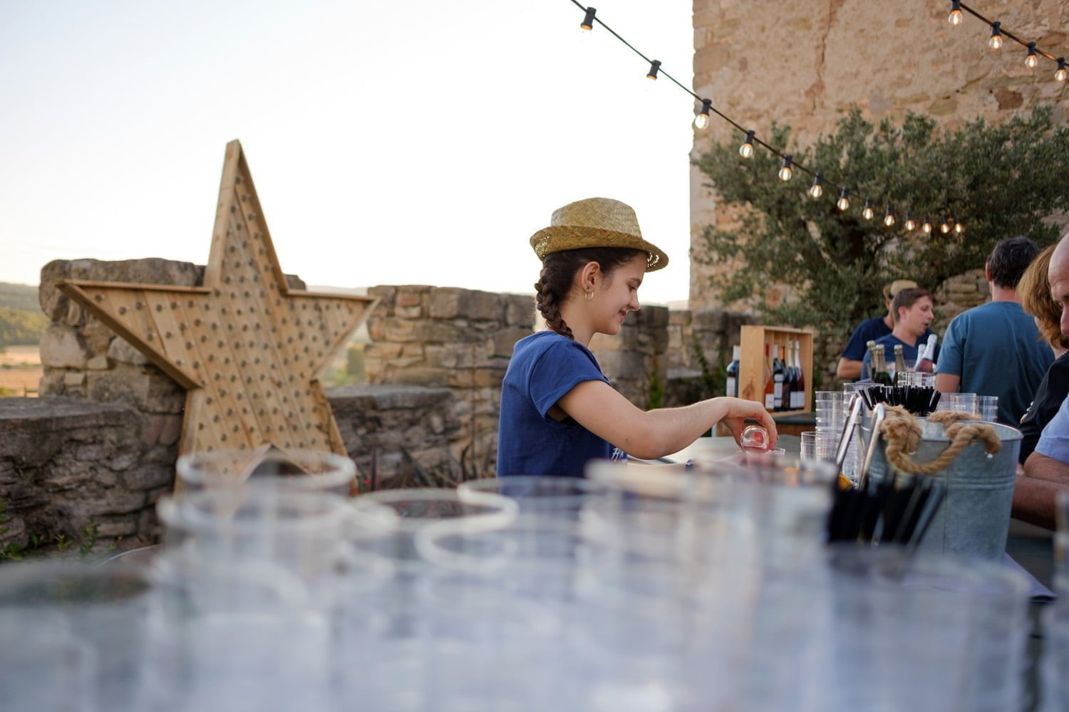 La vetllada va començar amb la posta de sol i els buffets freds. Amb la llum d’aquella hora màgica es van engegar els fanalets i la brasa va començar a fer bona olor. Sense adonar-nos, entre copes de vi i copes de cava, de la mà d’Adernats, va entrar la nit. I quan les converses estaven ben arrencades va arribar la nostra mestra pastissera amb el buffet de postres per enamorar a qualsevol: tartaletes i pastissos que entren pels ulls, combinacions de mousse i fruita que no deixen indiferents i gelats de bola i cucurutxo que et transporten a la infància.